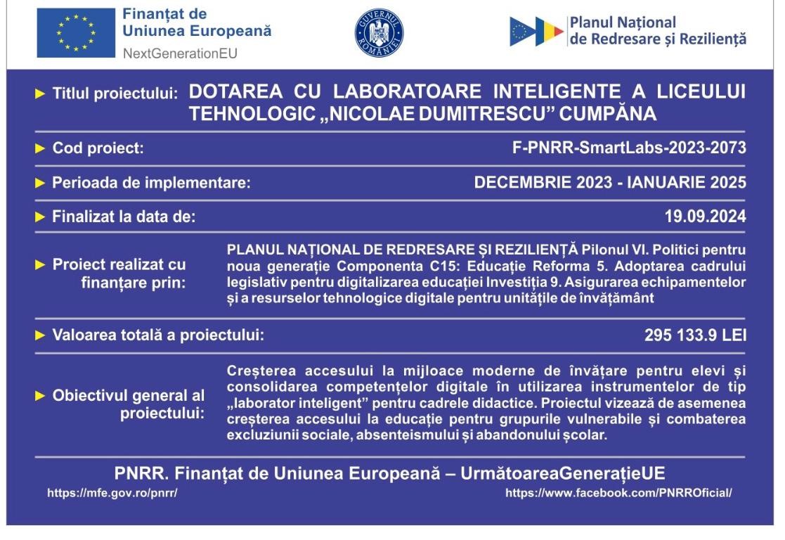 LICEUL TEHNOLOGIC ,, NICOLAE DUMITRESCU ” CUMPANA, în calitate de Beneficiar, anunță demararea proiectului „DOTAREA CU LABORATOARE INTELIGENTE A LICEULUI TEHNOLOGIC „NICOLAE DUMITRESCU” CUMPĂNA” / cod proiect F-PNRR-SmartLabs-2023-2073, proiect finanțat prin PLANUL NAȚIONAL DE REDRESARE ȘI REZILIENȚĂ Pilonul VI. Politici pentru noua generație Componenta C15: Educație Reforma 5. Adoptarea cadrului legislativ pentru digitalizarea educației Investiția 9. Asigurarea echipamentelor și a resurselor tehnologice digitale pentru unitățile de învățământ.